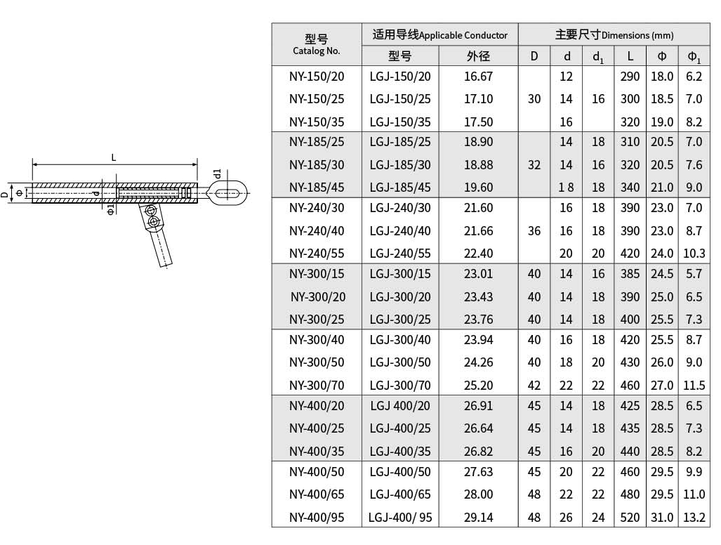 N-耐张线夹 L-螺栓型、铝合金 D-倒装式 Y-液压型B-爆压型